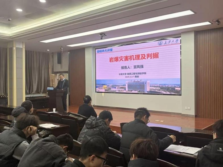 2025 年 12 月 17 日上午,长安大学地质工程与测绘学院宫凤强教授做客我校 “胡杨林大讲堂”,在雁塔校区图书馆报告厅带来了题为《岩爆灾害机理及判据》的专题学术报告。本次报告会由能源与矿业工程学院崔峰教授主持,研究生院主办、能源与矿业工程学院承办,全校近 150 名师生到场聆听,现场学术交流氛围十分浓厚。